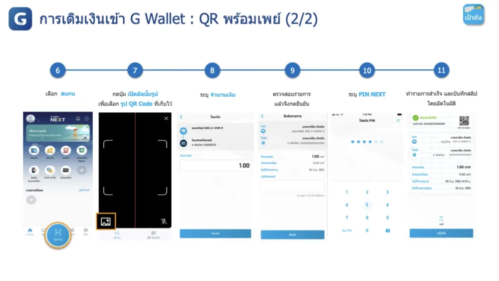 เปิด G Wallet → เติมเงิน → เลือกกรุงไทย → QR พร้อมเพย์ → สแกน/อัปโหลด QR → ใส่จำนวนเงิน → ยืนยัน → ใส่ PIN → สำเร็จ