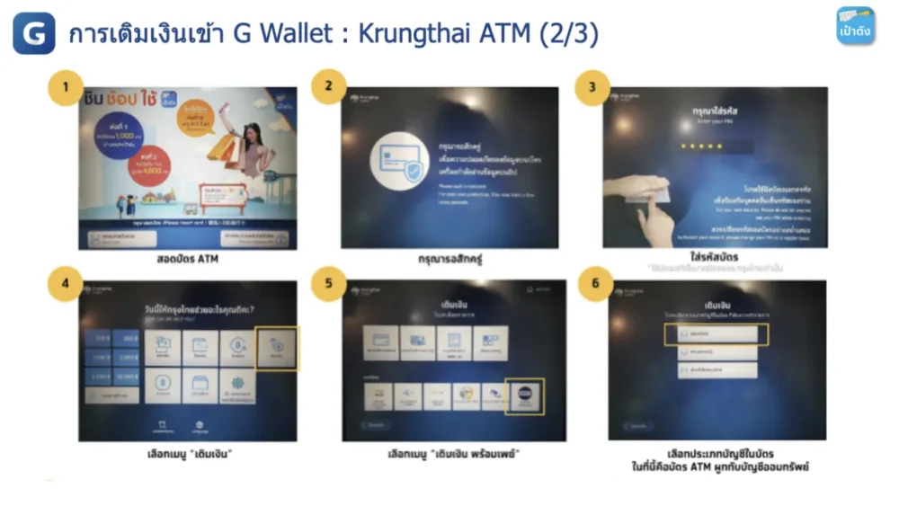 สอดบัตร → ใส่รหัส → เมนู “เติมเงิน” → “เติมเงินพร้อมเพย์” → เลือกประเภทบัญชี → ใส่ G Wallet ID → ใส่จำนวนเงิน → ตรวจสอบและยืนยัน → รับบัตร–สลิป
