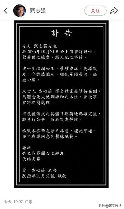 วงการบันเทิงฮ่องกงสุดเศร้า เมื่อสื่อต่างประเทศรายงานข่าวการจากไปของ เจิน จื้อเฉียง (Zhen Zhiqiang) อดีตนักแสดงชื่อดังจากช่อง ATV ผู้โด่งดังจากบท “จั่นเจา” ขุนศึกคู่ใจของเปาบุ้นจิ้น ในซีรีส์ระดับตำนาน ขุนศึกตระกูลหยาง (Legendary Yang’s Family) เขาเสียชีวิตลงอย่างสงบเมื่อวันที่ 21 ตุลาคมที่ผ่านมา ขณะมีอายุเพียง 59 ปี โดยมีภรรยา “ฟาง ซินหยวน” และครอบครัวอยู่เคียงข้างตลอดวินาทีสุดท้าย