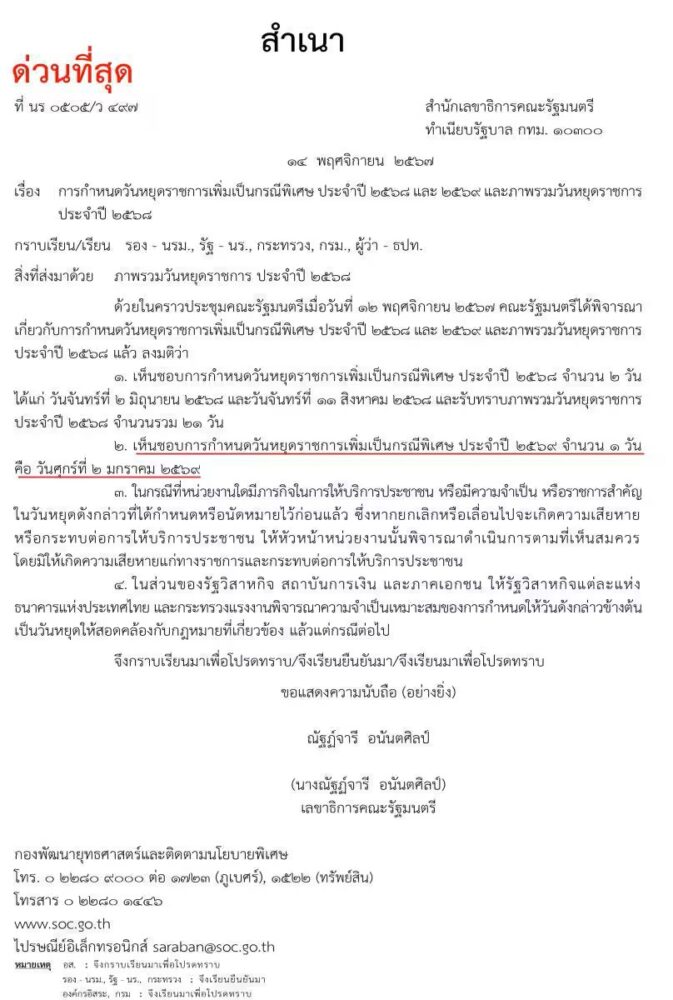 นอกจากนี้ ที่ประชุม ครม. ยังได้อนุมัติวันหยุดพิเศษของปี 2568 อีก 2 วัน ได้แก่