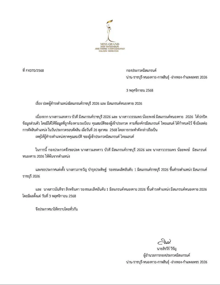ข้อความในประกาศที่ลงนามโดย นายสิรวีร์ วิรัญ ผู้อำนวยการกองประกวดมิสแกรนด์ น่าน–ราชบุรี–หนองคาย–กาฬสินธุ์–อ่างทอง–กำแพงเพชร 2026 ยืนยันว่า ทั้งสองสาวถูก “ปลดพ้นตำแหน่ง” อย่างเป็นทางการ พร้อมแต่งตั้งรองอันดับหนึ่งขึ้นรับตำแหน่งแทน
