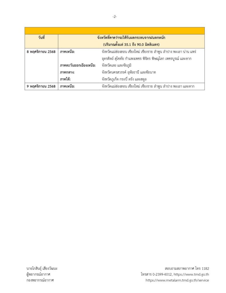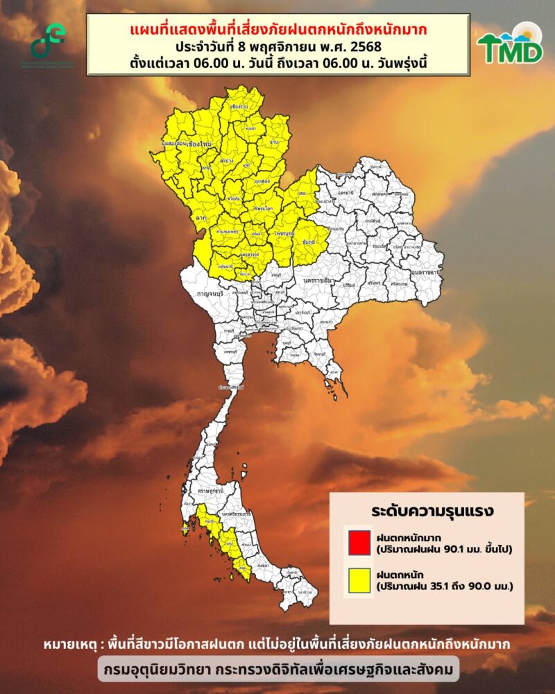 กรมอุตุนิยมวิทยา ออกประกาศพยากรณ์อากาศประจำวันที่ 8 พฤศจิกายน 2568 เตือนประชาชนทั่วไทยโดยเฉพาะภาคเหนือ ภาคกลาง และภาคตะวันออก เฝ้าระวังฝนตกหนักจากอิทธิพลของ หย่อมความกดอากาศต่ำ “คัลแมกี” (KALMAEGI) ที่อ่อนกำลังลงจากพายุโซนร้อน แต่ยังคงส่งแรงกระเพื่อมก่อให้เกิดฝนตกหนักในหลายพื้นที่ พร้อมเตือนชาวเรือใน ทะเลอันดามัน และ อ่าวไทย ให้หลีกเลี่ยงการออกจากฝั่ง เนื่องจากคลื่นสูงถึง 3 เมตร