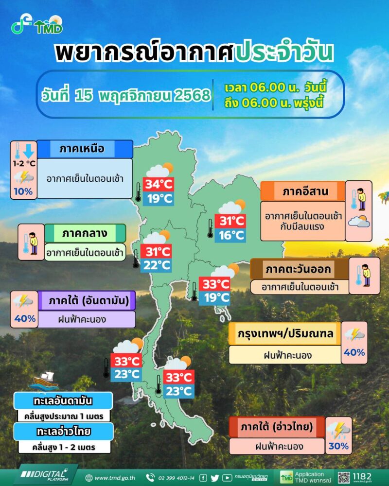 กรมอุตุนิยมวิทยาออกประกาศเตือนสำคัญ ฉบับที่ 1 (340/2568) เรื่อง “อากาศหนาวเย็นบริเวณประเทศไทยตอนบน ฝนตกหนักถึงหนักมากบริเวณภาคใต้ และคลื่นลมแรงบริเวณอ่าวไทย” โดยจะมีผลกระทบต่อสภาพอากาศของไทยอย่างต่อเนื่องในช่วงวันที่ 17–23 พฤศจิกายน 2568 ส่งสัญญาณชัดเจนว่าไทยกำลังก้าวเข้าสู่ช่วง ปลายฝนต้นหนาว อย่างเต็มตัว