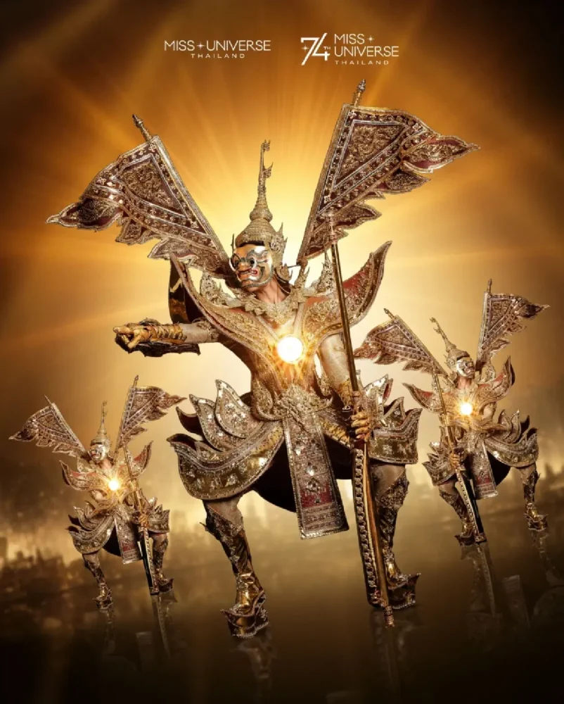 ผลงานออกแบบและตัดเย็บโดยทีม อาร์ทอัครัชเนรมิตศิลป์ ที่หยิบ “พญายักษ์” จากตำนานไทยมาเป็นตัวแทนของ พลังปกป้องแผ่นดิน เกียรติยศ และรากเหง้าวัฒนธรรม ผสมผสานกับโทนทองที่สะท้อนความอุดมสมบูรณ์และความรุ่งเรืองของสุวรรณภูมิ