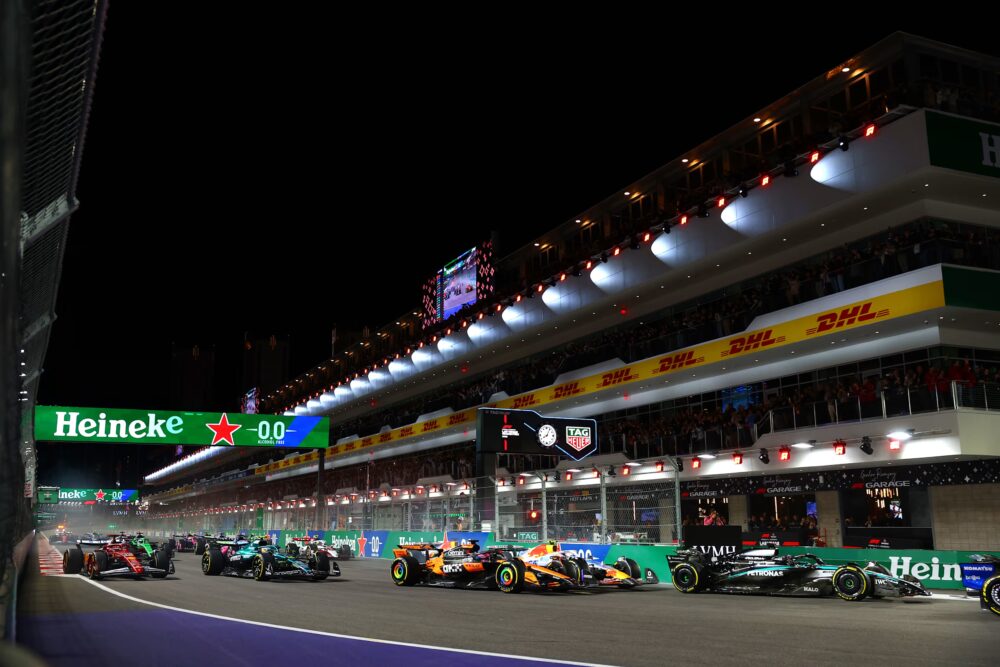 ไฟแดงดับลง Norris ที่ออกสตาร์ตจาก โพล ใช้จังหวะพุ่งขวางหน้า Verstappen อย่างดุดัน แต่ดันเบรกพลาดลึกไปในโค้งหนึ่ง ทำให้ต้องวิ่งออกขอบแทร็กก่อนเสียโมเมนตัมทันที