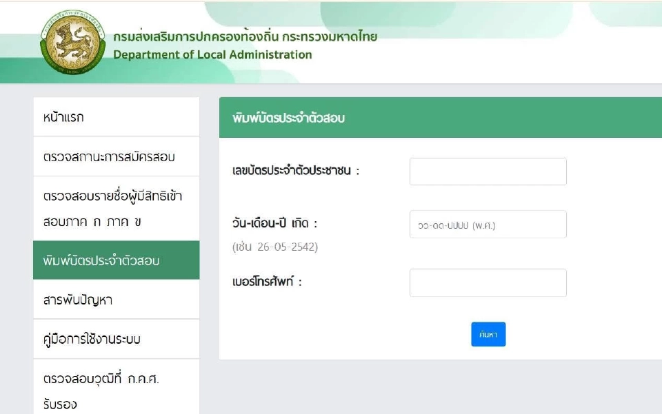 จากนั้นเลือกหัวข้อ “พิมพ์บัตรประจำตัวผู้เข้าสอบ” ใส่ข้อมูลครบถ้วนแล้วกดค้นหา