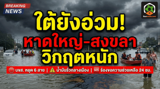 สถานการณ์ น้ำท่วมภาคใต้ ยังคงอยู่ในภาวะ วิกฤตหนัก โดยเฉพาะ อำเภอหาดใหญ่ จังหวัดสงขลา เมืองเศรษฐกิจใหญ่ของภาคใต้ที่เจอฝนถล่มหลายวันต่อเนื่อง ทำให้ระดับน้ำพุ่งสูงเร็วผิดปกติ สร้างผลกระทบแบบวงกว้าง ทั้งการเดินทาง การคมนาคม เศรษฐกิจ และความเป็นอยู่ของประชาชนนับหมื่นครัวเรือน
