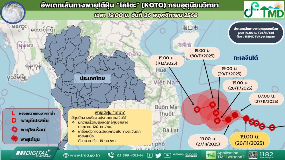 ข้อมูลจากศูนย์อุตุนิยมวิทยาญี่ปุ่น (JMA) และกรมอุตุนิยมวิทยาไทย ระบุว่า ช่วงค่ำวันที่ 26 พฤศจิกายน ตามเวลาท้องถิ่น พายุ “KOTO” มีศูนย์กลางอยู่บริเวณทะเลจีนใต้ตอนกลาง ความเร็วลมสูงสุดใกล้ศูนย์กลางราว 100–110 กม./ชม. เคลื่อนตัวทางทิศตะวันตกค่อนไปทางเหนือเล็กน้อย มุ่งหน้าเข้าใกล้ชายฝั่งเวียดนามตอนล่าง โดยข้างบนของพายุมีมวลอากาศเย็น/ความกดอากาศสูงจากจีนและเวียดนามกดทับอยู่ ทำให้เป็นระบบที่มีลักษณะ “แรงแต่เดินช้า” และมีโอกาสอ่อนกำลังลงก่อนขึ้นฝั่ง