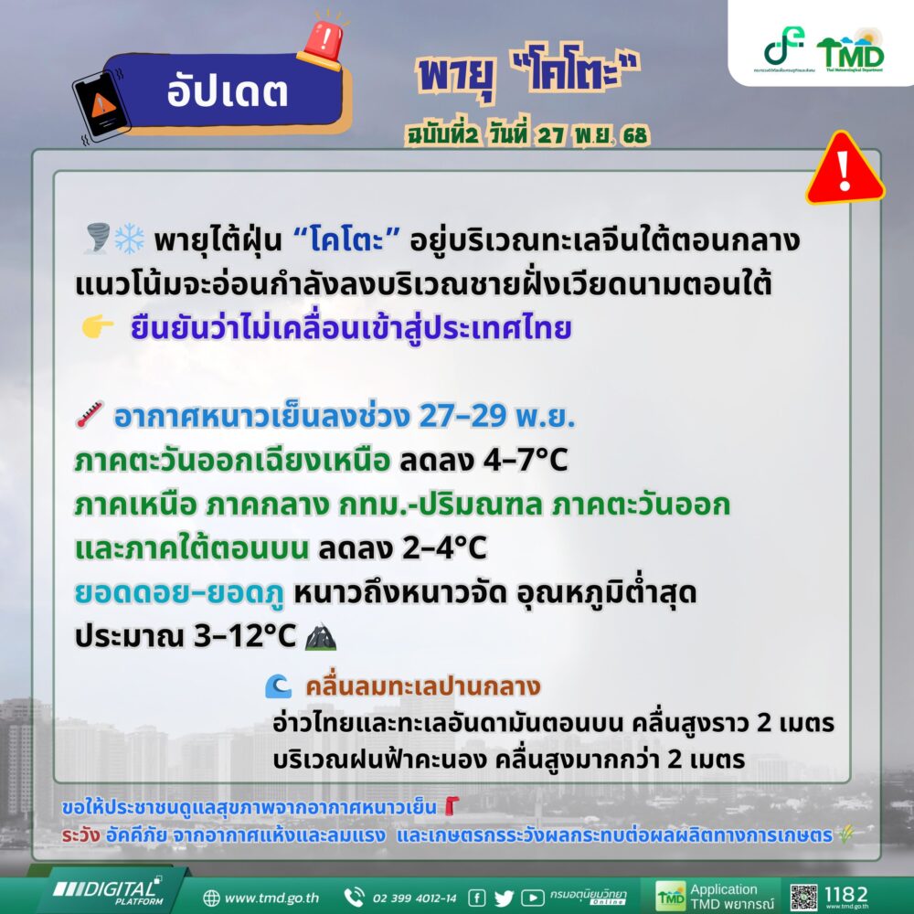 ประกาศของ กรมอุตุนิยมวิทยา ไทยย้ำชัดเจนในคำเตือนฉบับล่าสุดว่า พายุโคโตะ “ไม่เคลื่อนเข้าสู่ประเทศไทย” เส้นทางหลักของศูนย์กลางพายุจะเกี่ยวข้องกับทะเลจีนใต้และชายฝั่งเวียดนามตอนล่างเป็นหลัก ไม่ได้พุ่งเข้าฝั่งอ่าวไทยหรือแผ่นดินไทยโดยตรง