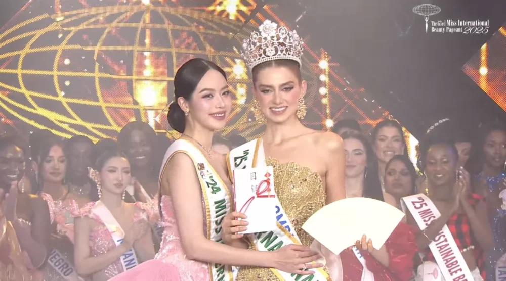 ค่ำคืนแห่งเวทีนางงามระดับโลกคึกคักอีกครั้งที่ Yoyogi National Stadium กรุงโตเกียว ญี่ปุ่น เมื่อ Catalina Duque ตัวแทนโคลอมเบีย ครองตำแหน่ง Miss International 2025 เฉือนชนะ 79 ผู้เข้าแข่งขันจากทั่วโลก ส่วน Myrna Esguerra ตัวแทนฟิลิปปินส์สร้างชื่อเข้า Top 5 และจบที่ 4th Runner-up พร้อมสปีชว่าด้วย SDG 4 & 17 (การศึกษาที่มีคุณภาพ และหุ้นส่วนเพื่อบรรลุเป้าหมาย) ที่กินใจกรรมการและผู้ชมทั้งฮอลล์ โดยมี Andrea Rubio (MI 2023) รับหน้าที่พิธีกรร่วมบนเวทีใหญ่ปีนี้อย่างสง่างาม.
