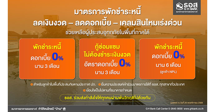 ธอส. ออก 7 มาตรการพักหนี้–ลดดอก–ซ่อมบ้าน ช่วยผู้ประสบอุทกภัยภาคใต้