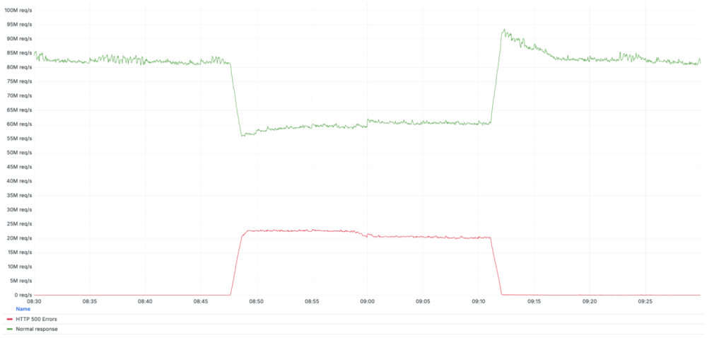 - คาดว่ามีทราฟฟิกประมาณ 28% ของ HTTP ทั้งหมดที่ผ่าน Cloudflare ได้รับผลกระทบ หรือพูดง่าย ๆ คือผู้ใช้จำนวนมหาศาลทั่วโลกเจอหน้าเออร์เรอร์ไปพร้อมกัน