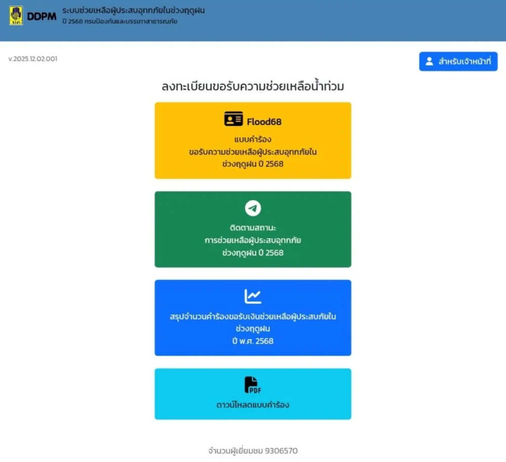 เว็บไซต์ flood68.disaster.go.th คือ “ศูนย์รวมข้อมูลออนไลน์” ที่ ปภ. ใช้สำหรับการลงทะเบียนขอรับเงินช่วยเหลือ และใช้เป็นช่องทาง ตรวจสอบสถานะ สิทธิ์ของผู้ประสบภัยน้ำท่วมฤดูฝนปี 2568 โดยตรง