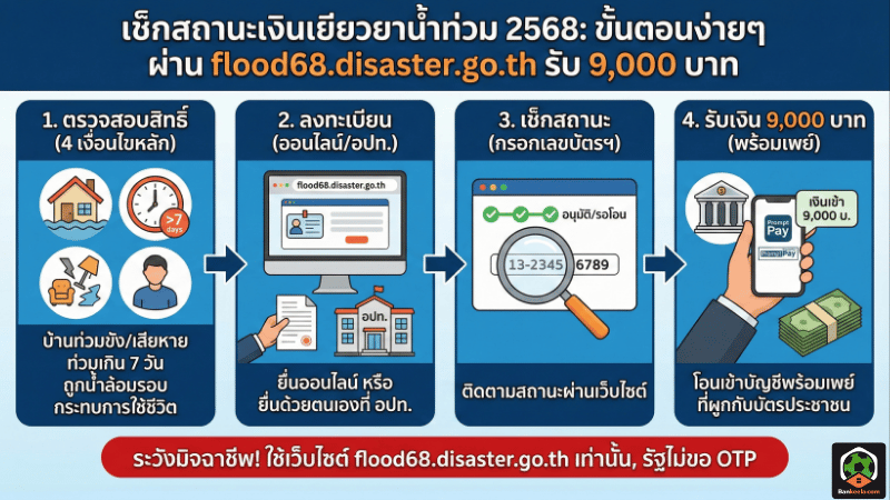 ทางหลักที่สะดวกที่สุดคือการลงทะเบียนออนไลน์ผ่านเว็บไซต์ https://flood68.disaster.go.th ตามขั้นตอนที่หลายหน่วยงานและสื่อกระแสหลักรายงานไว้ใกล้เคียงกัน ดังนี้