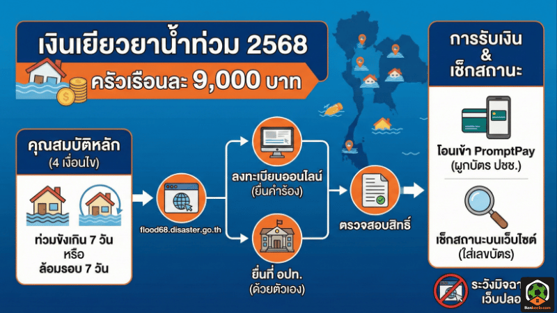 ช่วงปลายปี 2568 หลายจังหวัดเผชิญอุทกภัยหนัก บ้านพัง ข้าวของเสียหาย ชีวิตสะดุดกันเป็นแถบ รัฐบาลจึงออกมาตรการ เงินเยียวยาน้ำท่วม 2568 จ่ายแบบเหมาจ่ายครัวเรือนละ 9,000 บาท เพื่อช่วยบรรเทาภาระเบื้องต้นให้ผู้ประสบภัยในช่วงฤดูฝนปีนี้ โดยมอบหมายให้กรมป้องกันและบรรเทาสาธารณภัย (ปภ.) เป็นหน่วยงานหลักในการรับลงทะเบียน ตรวจสอบสิทธิ และโอนเงินเข้าบัญชีผ่านระบบพร้อมเพย์ผูกบัตรประชาชน