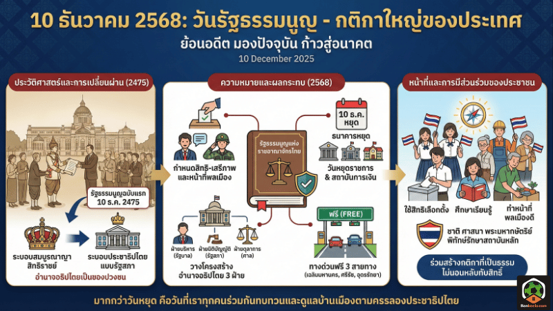 บ้านกีฬาเลยขอพาไปไล่ทีละประเด็น ตั้งแต่ประวัติ 24 มิถุนา 2475, รายชื่อรัฐธรรมนูญไทยทุกฉบับ, ความหมายวันรัฐธรรมนูญ, ทางด่วนฟรี 10 ธันวา 2568, ไปจนถึงหน้าที่ของประชาชนภายใต้รัฐธรรมนูญ – อ่านจบคือครบทุกมุมในบทความเดียว