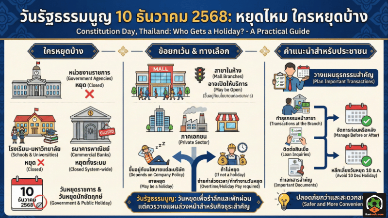 ดังนั้นใครมีธุรกรรมสำคัญ เช่น ทำธุรกรรมหน้าสาขา ติดต่อสินเชื่อ ทำเอกสารสำคัญ แนะนำให้จัดการก่อนหรือหลังวันรัฐธรรมนูญ 10 ธันวา 2568 จะปลอดภัยกว่า