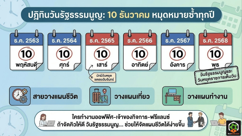 สำหรับสายวางแผนชีวิต–วางแผนเที่ยว–วางแผนทำงาน การรู้ล่วงหน้าว่า 10 ธันวาคมของทุกปีคือวันรัฐธรรมนูญและเป็นวันหยุดราชการ ช่วยให้จัดแผนชีวิตได้ง่ายขึ้น
