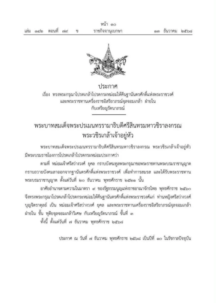 วันที่ 13 ธันวาคม 2568 กระแสข่าวที่คนไทยค้นหากันถล่มทลาย หนีไม่พ้นประกาศจาก ราชกิจจานุเบกษา เรื่องทรงพระกรุณาโปรดเกล้าโปรดกระหม่อม “คืนฐานันดรศักดิ์แห่งพระราชวงศ์” ให้แก่ “ท่านหญิงศรีสว่างวงศ์ บุญจิตราดุลย์” ให้กลับเป็น หม่อมเจ้าศรีสว่างวงศ์ ยุคล อีกครั้ง พร้อมพระราชทาน เครื่องราชอิสริยาภรณ์จุลจอมเกล้า ฝ่ายใน ชั้นทุติยจุลจอมเกล้าวิเศษ และ เหรียญรัตนาภรณ์ ชั้นที่ 3 โดยให้มีผล “ตั้งแต่วันที่ 7 ธันวาคม 2568”