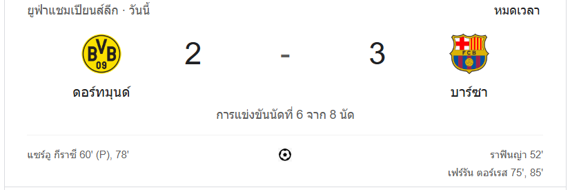 ในเกมที่เต็มไปด้วยความตื่นเต้น บาร์เซโลน่า เฉียบคมในจังหวะสุดท้ายและเก็บชัยชนะได้สำเร็จ แม้ว่าดอร์ทมุนด์จะมีโอกาสทำประตูจาก เซร์โฮ กีราซซี่ แต่ความแม่นยำของบาร์เซโลน่ายังคงเหนือกว่า