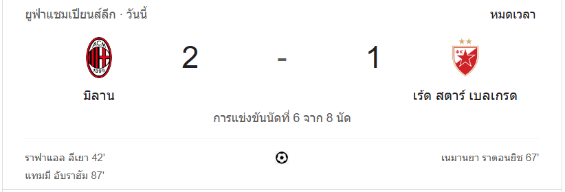 บ้านกีฬา รายงานผลบอลสดจากศึก ยูฟ่าแชมเปียนส์ลีก 2024 ในค่ำคืนที่ เอซี มิลาน เปิดบ้านเอาชนะ เซอร์เวน่า ซเวซด้า ไปด้วยสกอร์ 2-1 แมตช์นี้เต็มไปด้วยความเข้มข้นและจังหวะสำคัญ โดยมิลานได้สองประตูจาก ราฟาเอล เลเอา และ แทมมี่ อับราฮัม ที่ซัดปิดท้ายในนาทีที่ 87 ขณะที่ทีมเยือน เซอร์เวน่า ซเวซด้า พยายามทำเกมสู้จนตีเสมอได้จาก เนมันย่า ราดอนยิช แต่ไม่สามารถกลับมาคว้าคะแนนได้