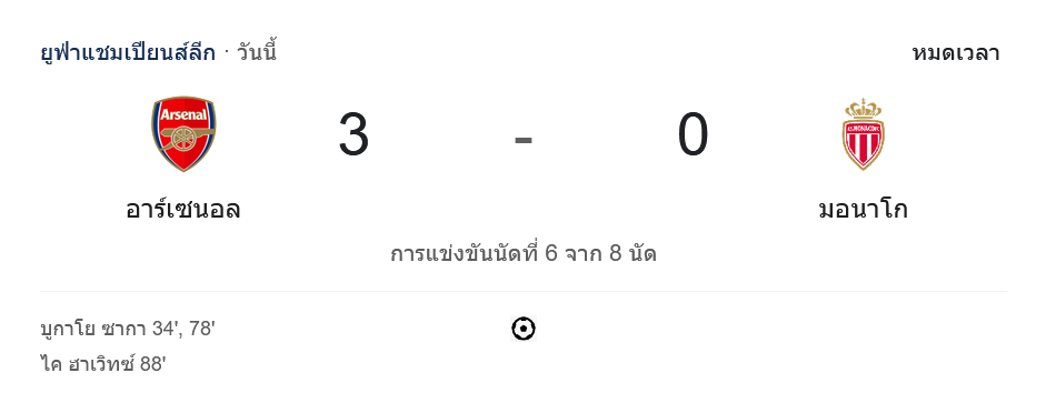 บ้านผลบอล สรุปผล อาร์เซนอล ไล่ถล่ม โมนาโก 3-0 ในศึกยูฟ่าแชมเปียนส์ลีก 2024