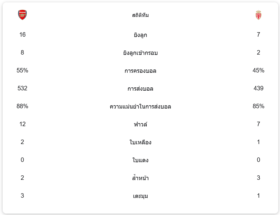 • ความแม่นยำในการส่งบอล: อาร์เซนอล 88%, โมนาโก 85%