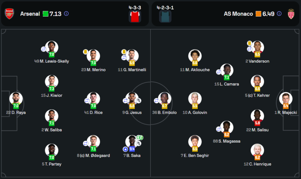 • การยิงประตู: อาร์เซนอล 16 ครั้ง, โมนาโก 7 ครั้ง