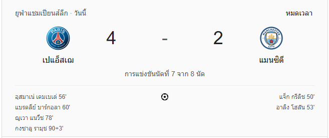 เกมนี้ ปารีส แซงต์ แชร์กแมง แสดงให้เห็นถึงความแข็งแกร่งและการไม่ยอมแพ้ แม้จะถูกนำไปก่อนถึง 2 ประตู แต่พวกเขากลับมาได้อย่างยิ่งใหญ่ ด้วยการบุกที่ต่อเนื่องและจังหวะเกมรับที่เหนียวแน่น พวกเขาสามารถพลิกสถานการณ์และคว้าชัยชนะที่ยิ่งใหญ่นี้ได้ ขณะที่ แมนเชสเตอร์ ซิตี้ แม้จะเริ่มเกมได้อย่างยอดเยี่ยม แต่กลับเสียสมาธิในช่วงครึ่งหลังจนต้องพ่ายแพ้ไป