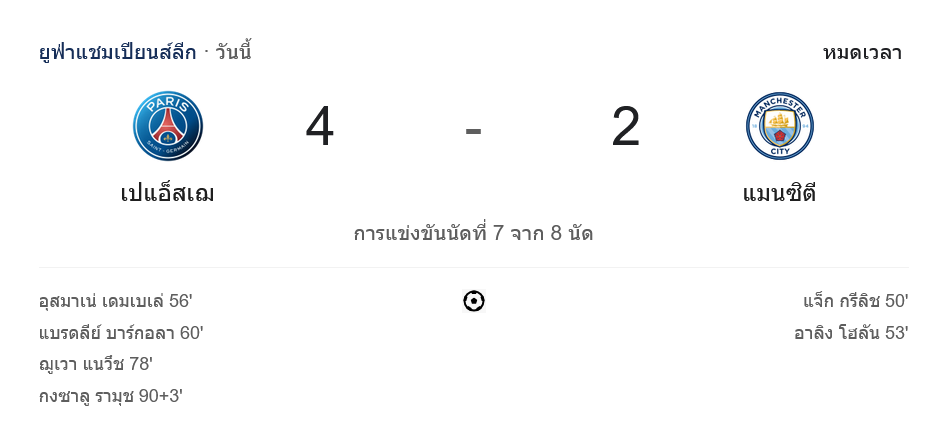 แมนฯ ซิตี้ เริ่มเสียสมาธิ และโดนลงโทษ นาทีที่ 78 ชูเอา เนเวส ซัดไกลสุดงามจากการแอสซิสต์ของ วิตินญ่า ส่งบอลเสียบสามเหลี่ยม เปแอสเช แซงนำ 3-2 และสุดท้าย นาทีที่ 90+3 กอนซาโล่ รามอส มายิงปิดกล่อง 4-2 ช่วยให้ทีมคว้าชัยอย่างสมบูรณ์แบบ