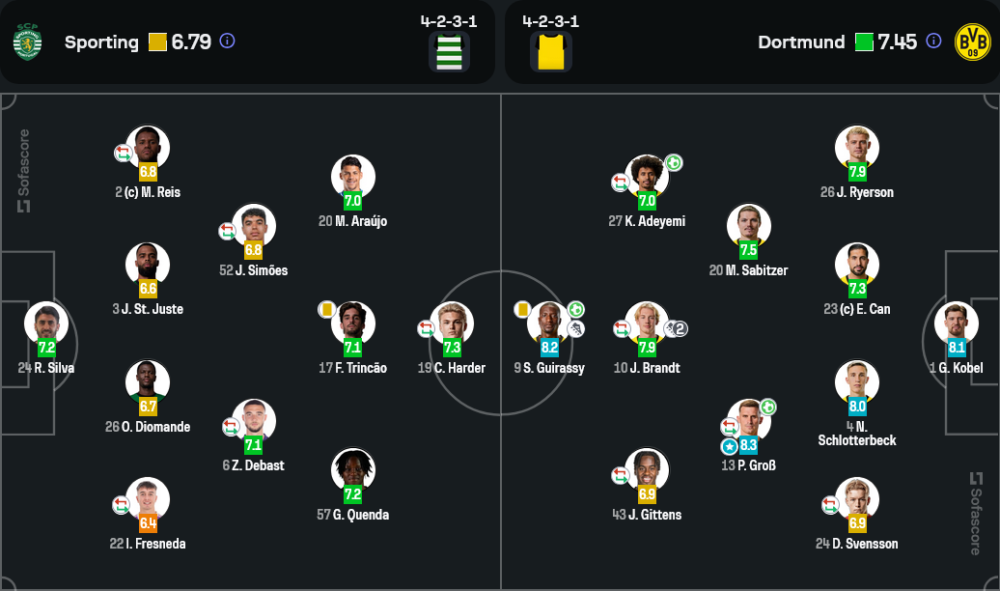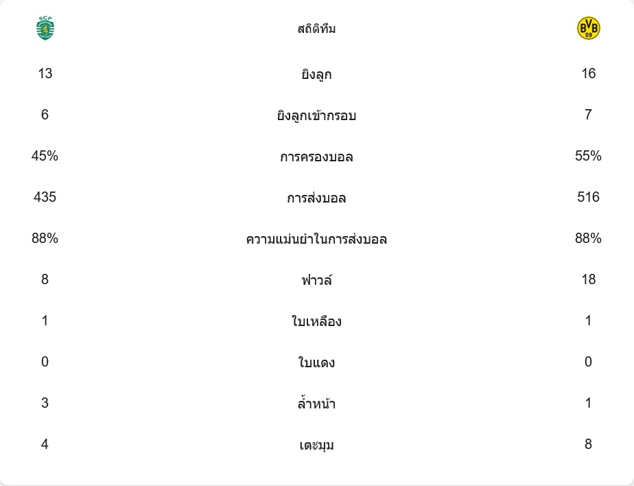 ดอร์ทมุนด์แสดงให้เห็นถึงเกมรุกที่หลากหลาย พวกเขามีโอกาสยิง 16 ครั้ง ตรงกรอบ 7 ครั้ง ขณะที่สปอร์ติ้ง ลิสบอนมีโอกาสยิง 13 ครั้ง แต่ตรงกรอบเพียง 6 ครั้ง แสดงให้เห็นถึงความแตกต่างของคุณภาพในการจบสกอร์