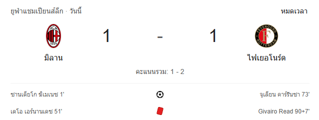 • นาทีที่ 47 กรรมการเป่านกหวีดจบครึ่งแรก เอซี มิลานนำเฟเยนูร์ด 1-0