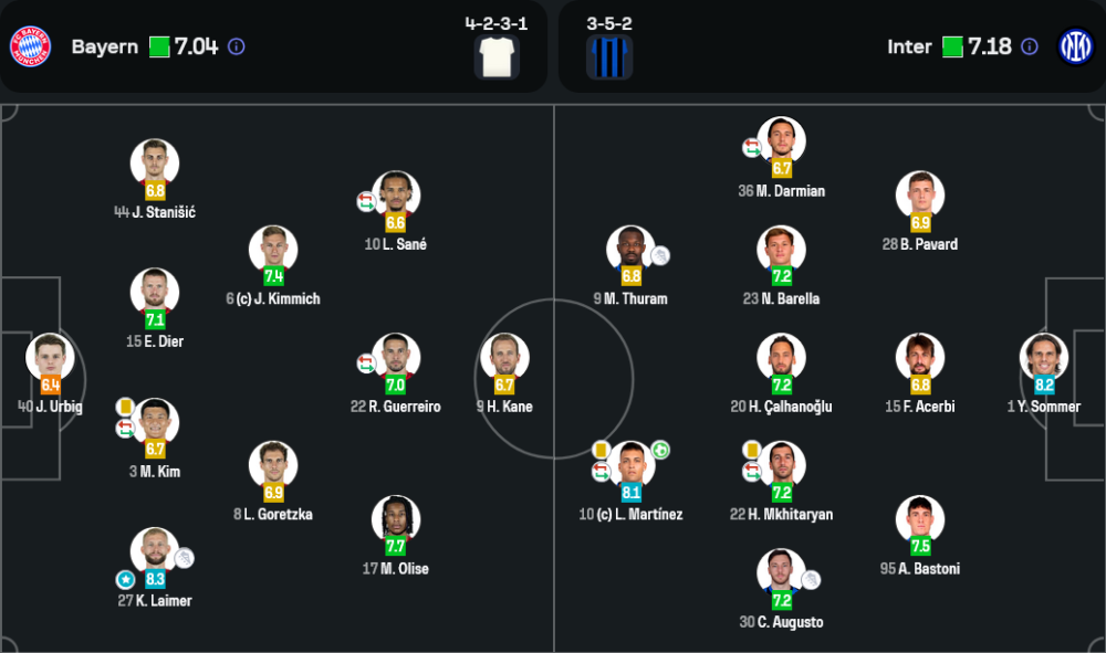 คอนราด ไลเมอร์ คือคนที่โดดเด่นที่สุดของเกมนี้ แม้บาเยิร์นจะแพ้ แต่เขาคือผู้ที่แบกเกมแดนกลางทั้งการแย่งบอลและการจ่ายทะลุช่อง โดยเฉพาะแอสซิสต์สุดเฉียบให้มุลเลอร์ยิงตีเสมอ นอกจากการเคลื่อนที่ที่แม่นยำแล้ว ไลเมอร์ยังแสดงให้เห็นถึงภาวะผู้นำและความกล้าหาญในจังหวะสำคัญ ได้คะแนน 8.3 เต็มที่จาก SofaScore