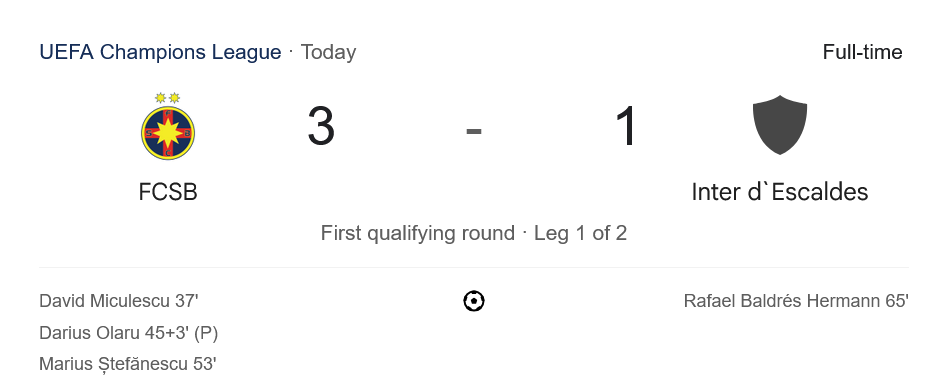 ศึก ยูฟ่าแชมเปียนส์ลีก รอบคัดเลือก รอบแรก เลกแรก ที่โรมาเนีย สเตอัว บูคาเรสต์ โชว์ฟอร์มดุดัน เปิดบ้านไล่ถล่ม อินเตอร์ คลับ ด’เอสคัลเดส 3-1 บ้านกีฬาเกาะติด ผลบอลสด ตลอดเกม และยืนยันว่าเจ้าถิ่นเหนือกว่าอย่างชัดเจน โดยเกมนี้ดาวิด มิคูเลสคู, ดาริอุส โอลารู และมาริอุส สเตฟาเนสคู ช่วยกันยิงให้ทีมคว้าความได้เปรียบก่อนไปเยือนเลกสอง