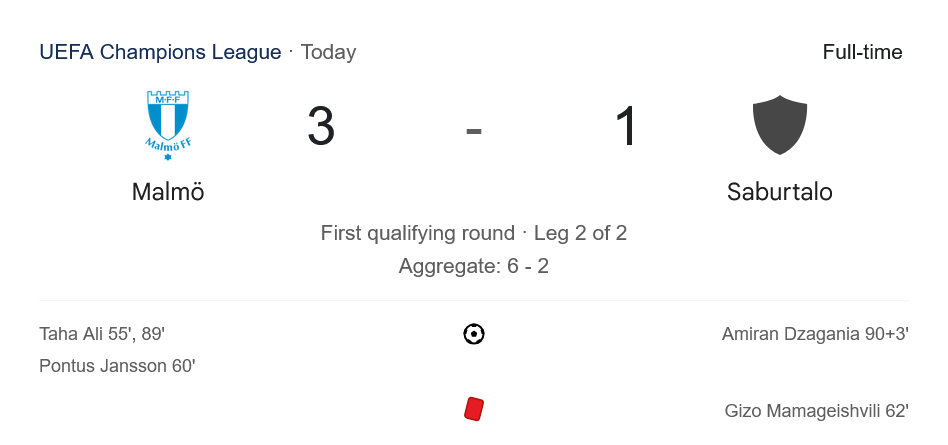 จาก : ผลบอลสด ยูฟ่าแชมเปียนส์ลีก รอบคัดเลือก รอบแรก เลกสอง ระหว่าง มัลโม่ เอฟเอฟ 3-1 เอฟซี ซาเบอร์ทาโล ทบิลีซี วันนี้ 16/7/68 – บ้านกีฬา