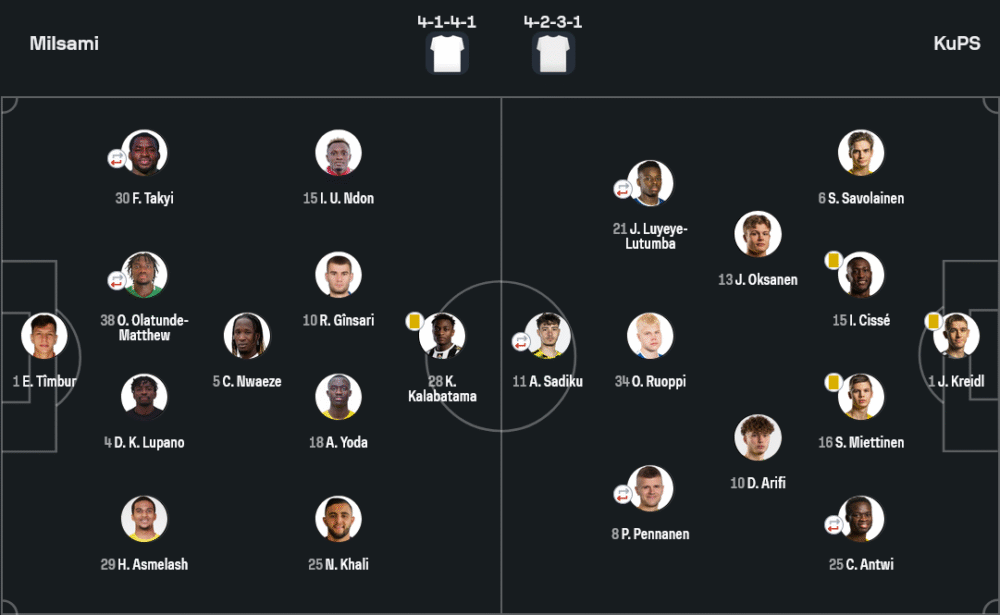 ตัวสำรองที่ลงสนาม: นิโก้ แฮมาลาอิเนน, โมฮาเหม็ด ตูเร่, เจอร์รี่ วูติไลเนน, บ็อบ นี อาร์มาห์, อาตู ฮาคาลา, อาร์ตตู ไฮโนนเนน, ลอรี่ ซาฮิมา, มิอิโล พิตคาเนน