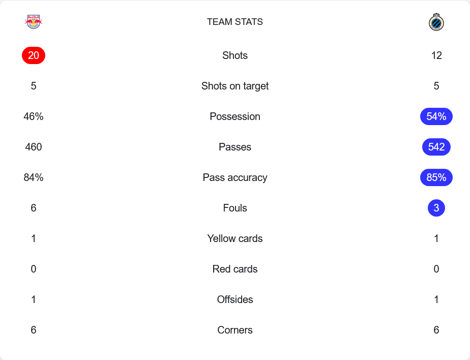 ซัลซ์บวร์กเป็นฝ่ายที่มีโอกาสยิงมากกว่าอย่างชัดเจนถึง 20 ครั้ง แต่ยิงเข้ากรอบเพียง 5 หน ต่างจากคลับบรูซที่มีโอกาสยิง 12 ครั้ง เข้ากรอบ 5 ครั้งเช่นกัน โดยทีมเยือนมีเปอร์เซ็นต์การครองบอลสูงกว่าที่ 54% และผ่านบอลมากถึง 542 ครั้ง เทียบกับ 460 ครั้งของเจ้าบ้าน ความแม่นยำในการจ่ายบอลของทั้งสองทีมสูสีที่ราว 85% การฟาวล์ของซัลซ์บวร์กมากกว่าเล็กน้อย แสดงให้เห็นว่าพวกเขาไล่บอลอย่างหนักเพื่อหวังทวงคืนประตู