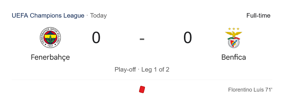 ศึกยูฟ่าแชมเปียนส์ลีก เพลย์ออฟรอบสุดท้าย นัดแรก ที่ประเทศตุรกี “เฟเนร์บาห์เช่” เปิดรังต้อนรับการมาเยือนของ “เบนฟิก้า” จบลงด้วยผลบอลสดเสมอ 0-0 แบบดุเดือด ถึงแม้ทีมเยือนจะเหลือผู้เล่นเพียง 10 คนตั้งแต่นาทีที่ 71 จากใบแดงของ ฟลอเรนติโน่ ลุยส์ แต่เจ้าถิ่นก็ไม่สามารถเจาะตาข่ายได้ ทำให้เกมนี้ยังเปิดกว้างรอชี้ชะตาในนัดที่สอง