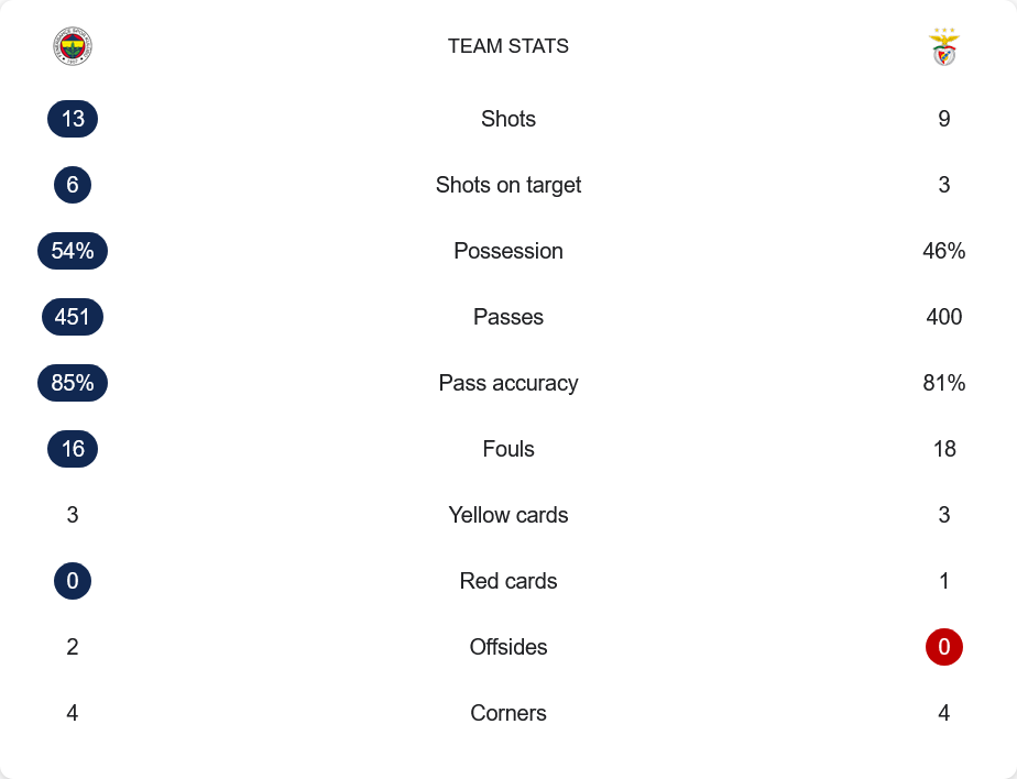 เกมนี้เฟเนร์บาห์เช่มีโอกาสยิงมากกว่า 13 ต่อ 9 ครั้ง และเข้ากรอบ 6 ต่อ 3 แต่ยังไม่สามารถเปลี่ยนเป็นประตูได้ การครองบอลเจ้าถิ่นเหนือกว่า 54% ต่อ 46% ผ่านบอล 451 ครั้ง ความแม่นยำ 85% ส่วนเบนฟิก้าผ่านบอล 400 ครั้ง แม่นยำ 81% ความแตกต่างคือเกมรับของทีมเยือนที่เหนียวแน่น และผู้รักษาประตูทรูบินที่ช่วยทีมรอดพ้นการเสียประตูได้หลายครั้ง