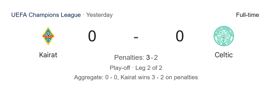 ⚽ จุดโทษ: Kairat ยิงเข้า 3 ครั้ง (Martynovich, Ofri, Sorokin) พลาด 2 ส่วน Celtic ยิงเข้าเพียง 2 (McGregor, Engels) แต่พลาดถึง 3 คน (Maeda, McCowan, Idah)
