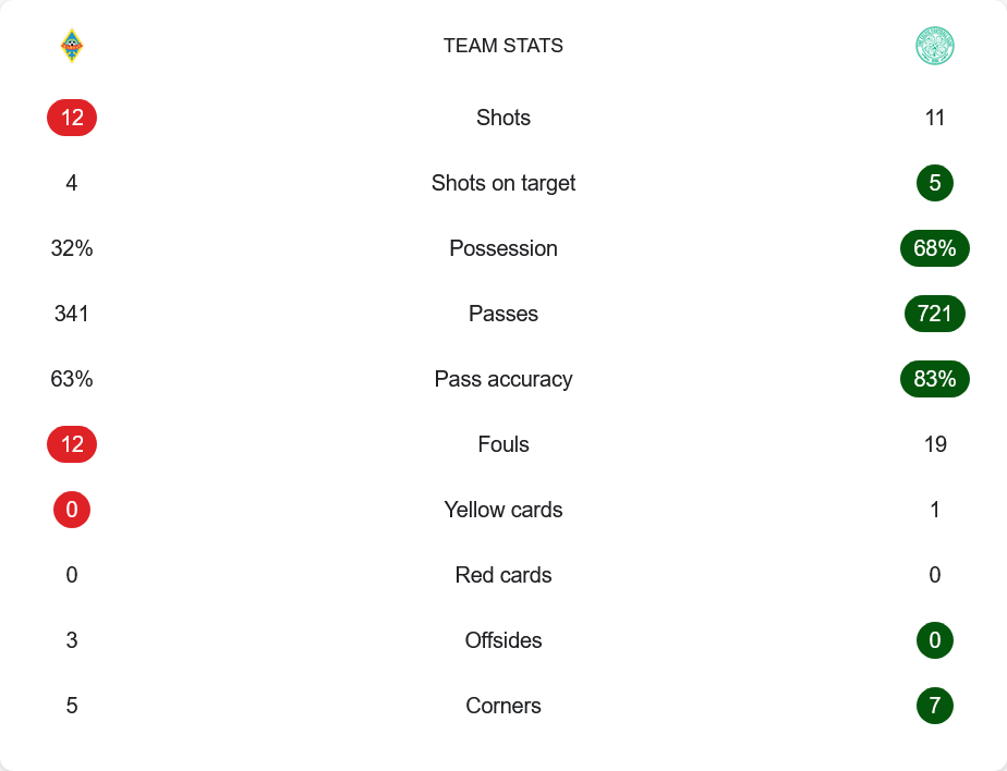 เกมนี้สะท้อนภาพชัดเจนว่าเซลติกเหนือกว่าทั้งการครองบอลและความแม่นยำในการจ่ายบอล โดยมีการครองบอลมากถึง 68% ผ่านบอล 721 ครั้ง ความแม่นยำ 83% ในขณะที่ไครัตครองบอลเพียง 32% แต่กลับเล่นเกมรับอย่างมีวินัยและเหนียวแน่นจนไม่เสียประตู ทั้งสองทีมต่างมีโอกาสใกล้เคียงพอกัน (12 ต่อ 11 ครั้ง) แต่ไครัตยิงตรงกรอบเพียง 4 ครั้ง ขณะที่เซลติกทำได้ 5 ครั้ง