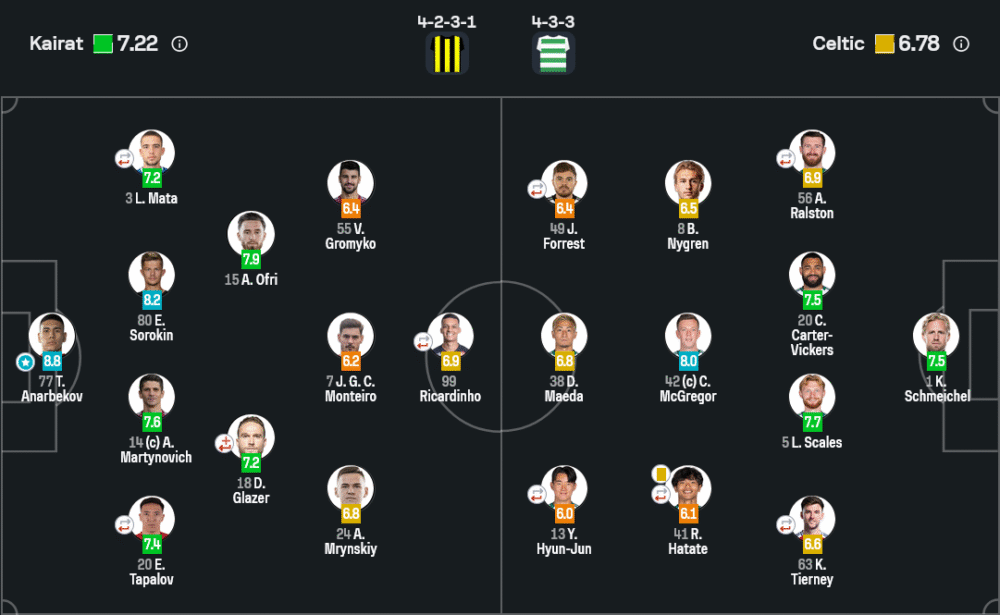 ในมุมมอง วิเคราะห์บอล เกมนี้ เซลติกยึดระบบ 4-3-3 พยายามครองบอลและบุกจากแดนกลางเป็นหลัก โดยมี McGregor คุมเกม แต่ปัญหาคือการจบสกอร์ที่ไร้ความเฉียบคม ขณะที่ไครัตมาในแผน 4-2-3-1 เน้นเกมรับเหนียวแน่นและสวนกลับเร็ว จุดเด่นคือคู่เซ็นเตอร์ Sorokin และ Martynovich ที่ตัดบอลได้หลายครั้ง รวมถึงผู้รักษาประตู Anarbekov ที่เซฟอุตลุตจนพาทีมอยู่รอดถึงดวลจุดโทษ