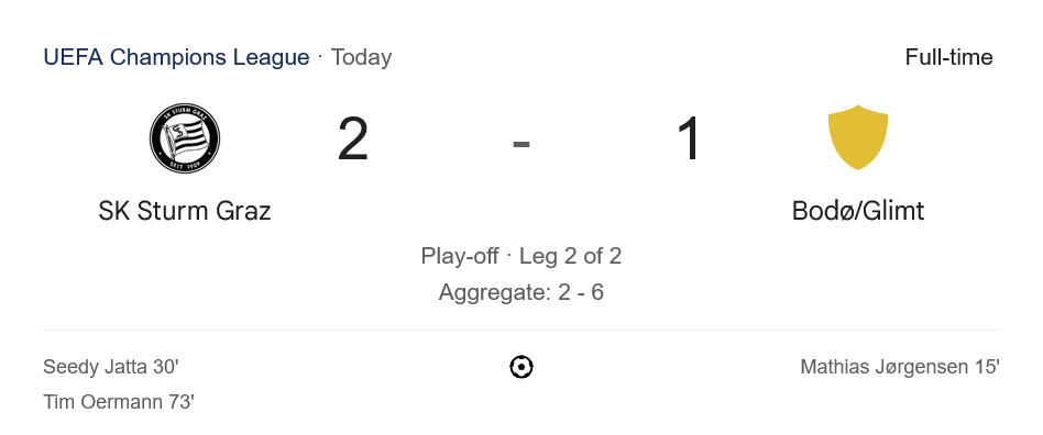 ค่ำคืนแห่งศึก ยูฟ่าแชมเปียนส์ลีก เพลย์ออฟ เต็มไปด้วยความมันส์ระทึก เมื่อ สตวร์ม กราซ เปิดบ้านเอาชนะ โบโด กลิมท์ ไป 2-1 แต่ไม่เพียงพอต่อการเข้ารอบ เพราะรวมผลสองนัด ทีมจากนอร์เวย์ยังเข้าวินแบบสบาย ๆ ด้วยสกอร์รวม 6-2 เกมนี้ถูกจับตามองในตาราง ผลบอลสด และถูกแฟนบอลพูดถึงอย่างกว้างขวาง