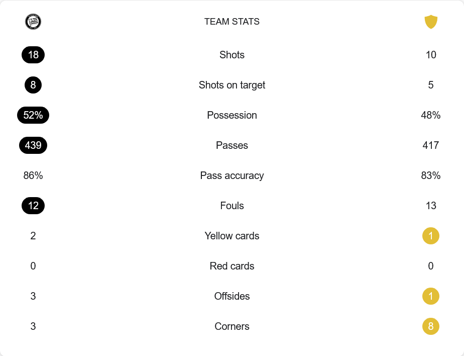 เกมนี้ตัวเลขค่อนข้างใกล้เคียงกัน สตวร์ม กราซครองบอล 52% มีโอกาสยิง 18 ครั้ง เข้ากรอบ 8 ครั้ง ขณะที่โบโด กลิมท์ครองบอล 48% ยิง 10 ครั้ง เข้ากรอบ 5 ครั้ง การจ่ายบอลของทั้งสองทีมแม่นยำพอ ๆ กัน โดยเจ้าบ้าน 86% ส่วนทีมเยือน 83% จุดต่างคือการจบสกอร์ที่ทีมจากออสเตรียทำได้คมกว่าในนัดนี้