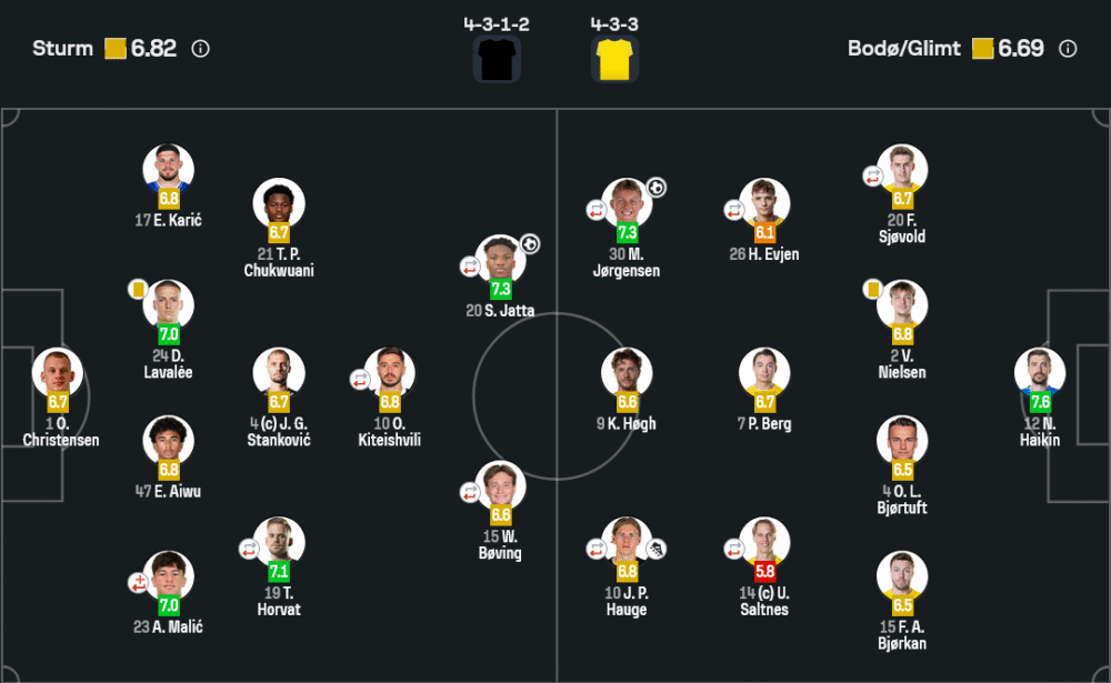 ในแง่ วิเคราะห์บอล สตวร์ม กราซใช้ระบบ 4-3-1-2 เน้นเกมตรงกลางและการเชื่อมระหว่าง Kiteishvili กับ Jatta ทำให้มีจังหวะทะลุเข้าไปลุ้นบ่อยครั้ง ส่วนโบโด กลิมท์ใช้แผน 4-3-3 ที่เน้นความเร็วทางริมเส้น โดยมี Jørgensen เป็นหัวหอกคอยหาจังหวะจบสกอร์ เกมนี้เห็นได้ชัดว่าสตวร์ม กราซพยายามกดดันสูงและใช้การเข้าปะทะหนัก แต่แนวรับโบโด กลิมท์ยังคงนิ่งและอาศัยการโต้กลับที่หวังผลได้