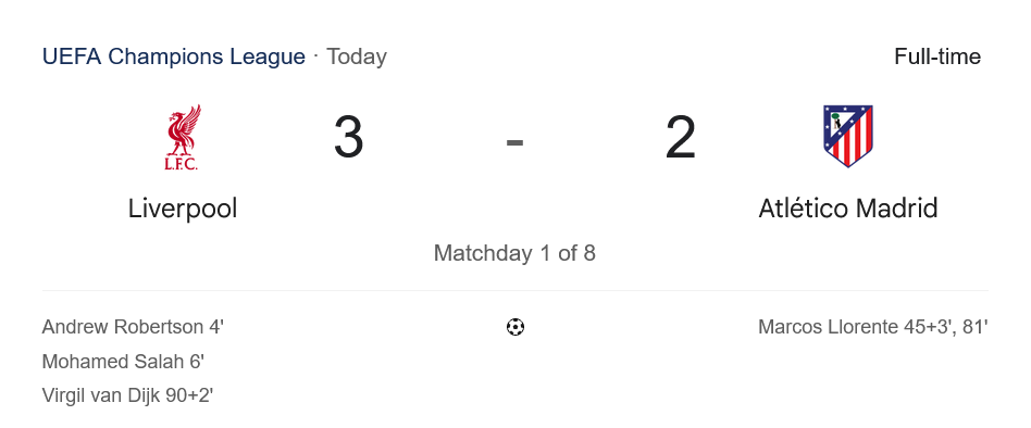 ชัยชนะสำคัญนี้ส่งให้ลิเวอร์พูลมี 3 แต้มแรก รั้งอันดับ 7 ของกลุ่มร่วมกับทีมดังยุโรปหลายทีม ส่วนแอตเลติโก้แพ้นัดเปิดหัว จมอยู่โซนท้ายตาราง ต้องเร่งเครื่องในเกมต่อไปหากไม่อยากเสียโอกาสเข้ารอบ