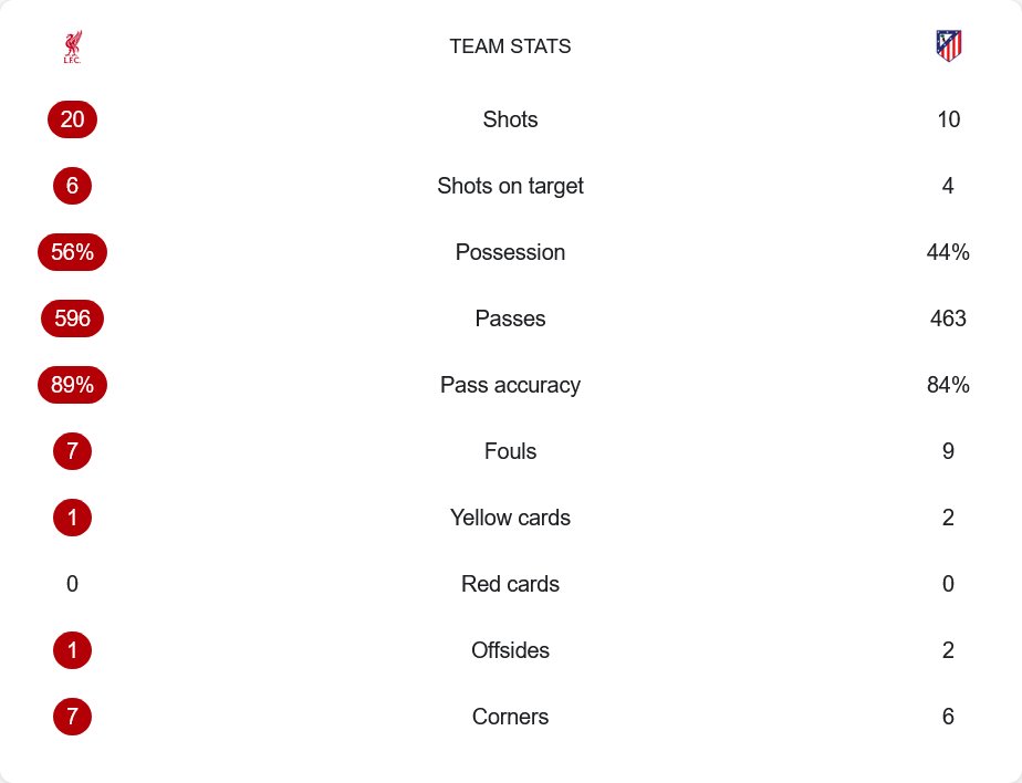 หงส์แดงครองบอลเหนือกว่าเล็กน้อย 56% ต่อ 44% สร้างโอกาสยิงได้ถึง 20 ครั้ง เข้ากรอบ 6 ขณะที่แอตเลติโก้มีโอกาส 10 ครั้ง เข้ากรอบ 4 ลิเวอร์พูลจ่ายบอลแม่นยำ 89% มากกว่าแอตเลติโก้ที่ 84% ทั้งสองทีมเล่นหนักพอสมควร มีใบเหลืองรวมกันถึง 3 ใบ และเกมเปิดแลกมันส์จนแฟนบอลหายใจไม่ทั่วท้อง