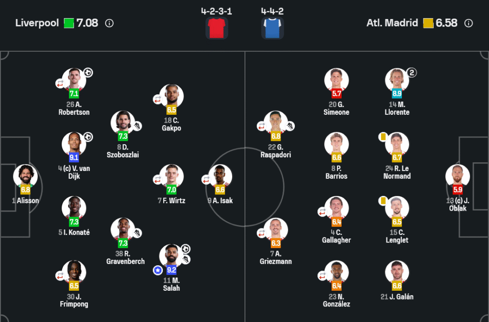 การ วิเคราะห์บอล จากรูปเกมชัดเจนว่าลิเวอร์พูลครองบอลมากกว่า 56% ใช้การขึ้นเกมเร็วทางริมเส้นเป็นหลัก โดยซาลาห์และโรเบิร์ตสันสร้างความอันตรายต่อเนื่อง ฟาน ไดค์ คุมเกมรับแน่นพร้อมช่วยทำประตูชัย ส่วนแอตเลติโก้ที่เล่นด้วยระบบ 4-4-2 อาศัยจังหวะสวนกลับและการเข้าทำของยอเรนเต้เป็นอาวุธสำคัญ แต่การป้องกันลูกกลางอากาศยังเป็นปัญหาใหญ่