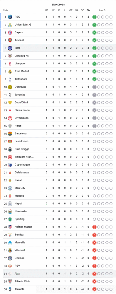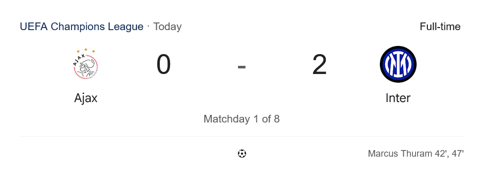 ชัยชนะนัดนี้ทำให้อินเตอร์เก็บ 3 แต้มแรก ขึ้นรั้งอันดับ 5 ของตารางกลุ่ม ส่วนอาแจกซ์แพ้คาบ้านหล่นไปอยู่อันดับ 34 ร่วมกับทีมท้ายตาราง ต้องเร่งแก้เกมในนัดต่อไปหากไม่อยากตกรอบเร็ว
