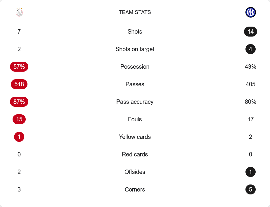 อาแจกซ์ครองบอลมากกว่าที่ 57% แต่ยิงรวมเพียง 7 ครั้ง เข้ากรอบ 2 ส่วนอินเตอร์แม้ครองบอลแค่ 43% แต่มีโอกาสยิง 14 ครั้ง เข้ากรอบ 4 จังหวะการจ่ายบอล อาแจกซ์แม่นยำ 87% เหนือกว่าอินเตอร์ที่ 80% ทว่าทีมเยือนใช้ความคมจบสกอร์ได้ดีกว่า เกมนี้มีใบเหลืองรวม 3 ใบ และฟาวล์กันดุเดือดรวม 32 ครั้ง